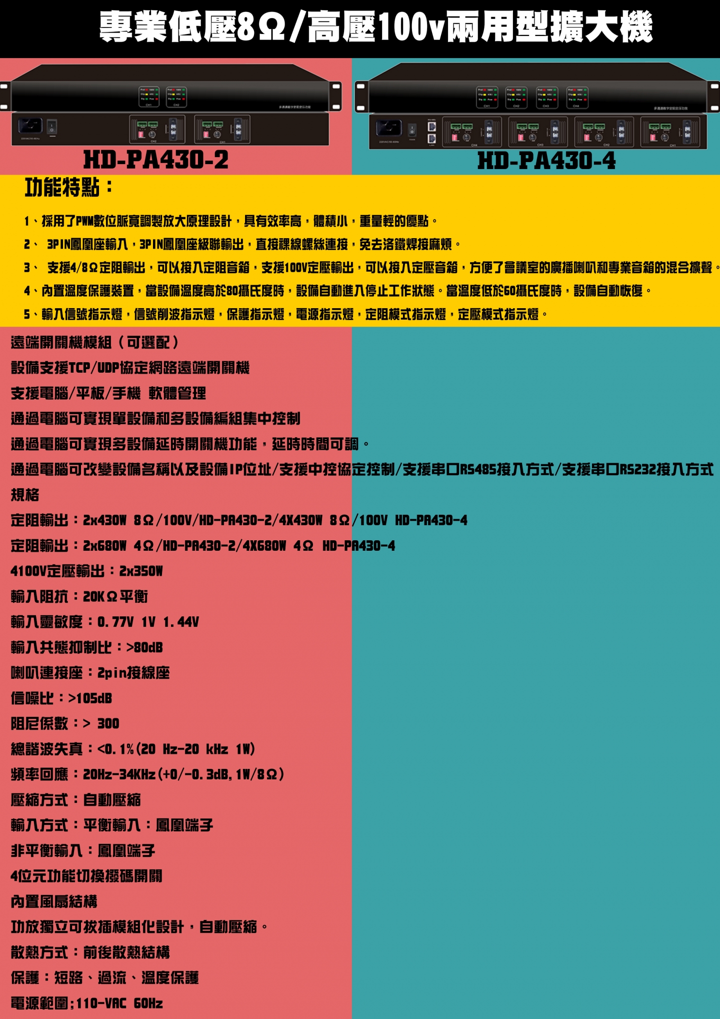 HD PA430-2/430-4 專業低壓8Ω/高壓100V擴大機