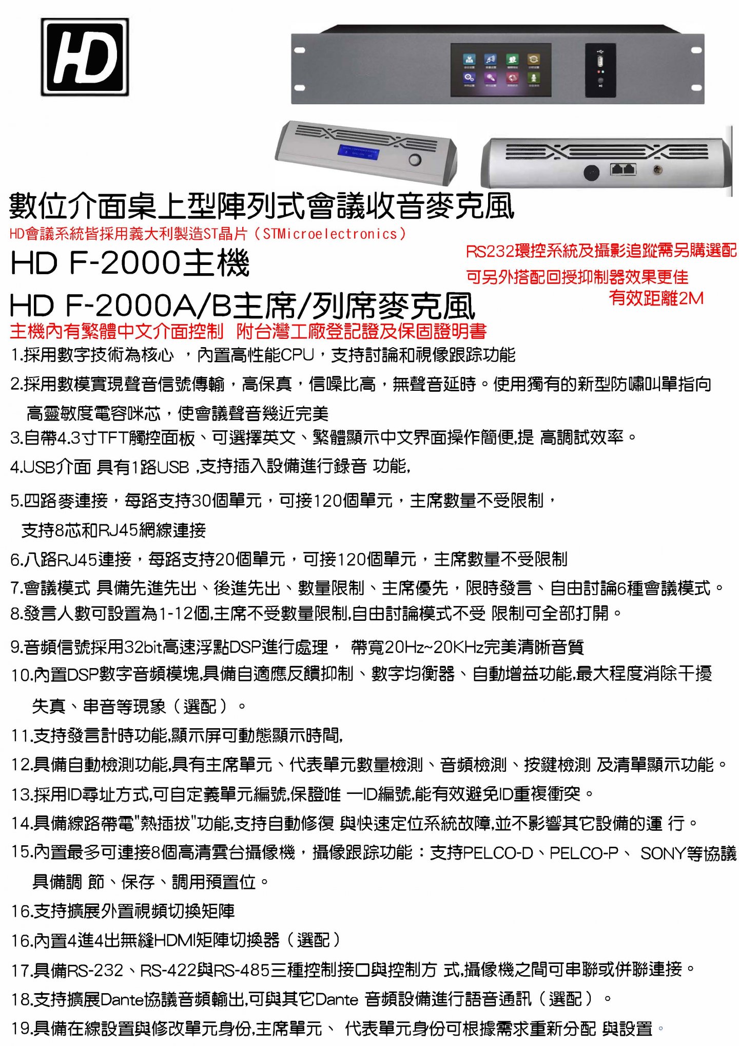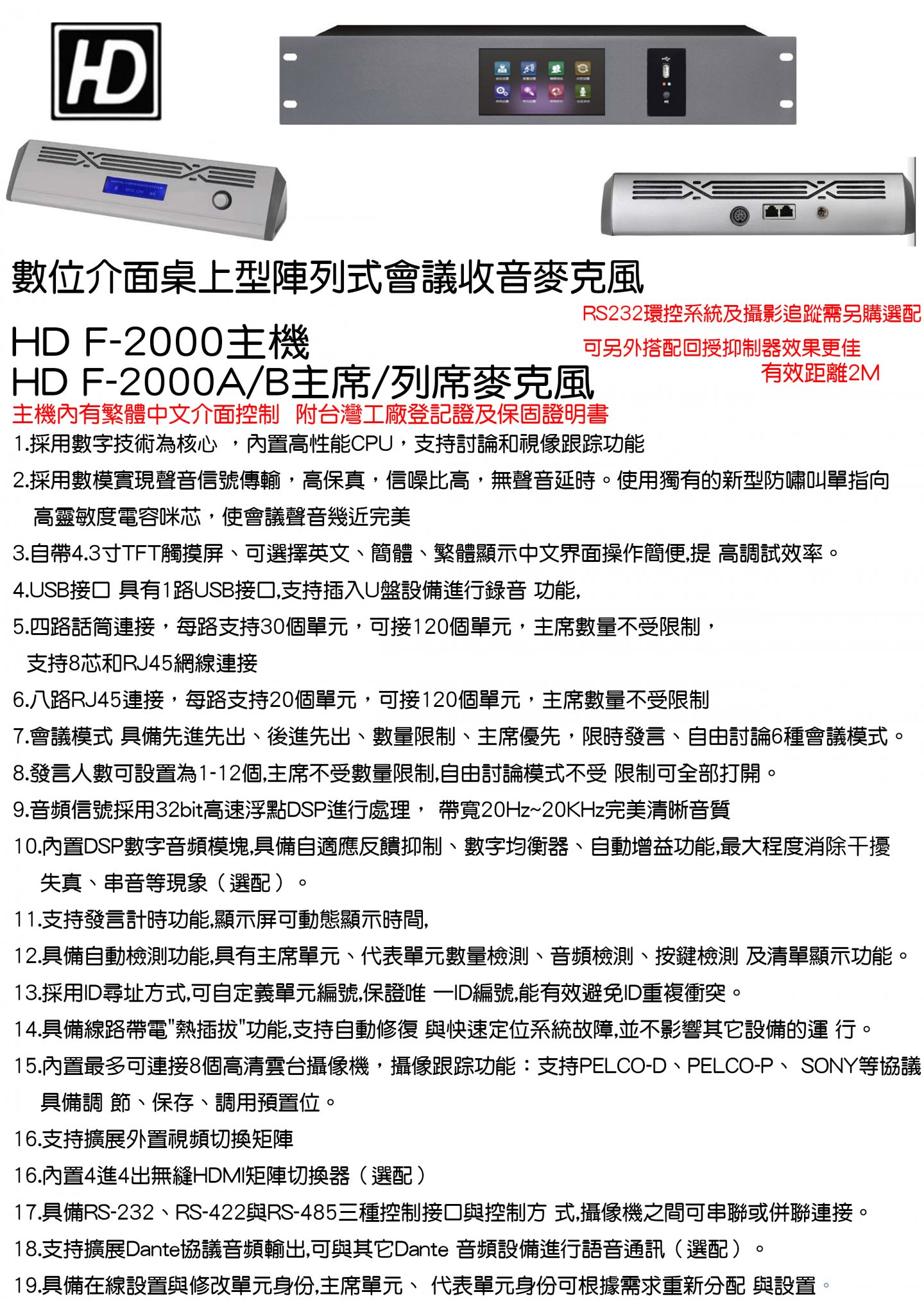 HD F-2000 數位介面桌上型陣列式會議收音麥克風