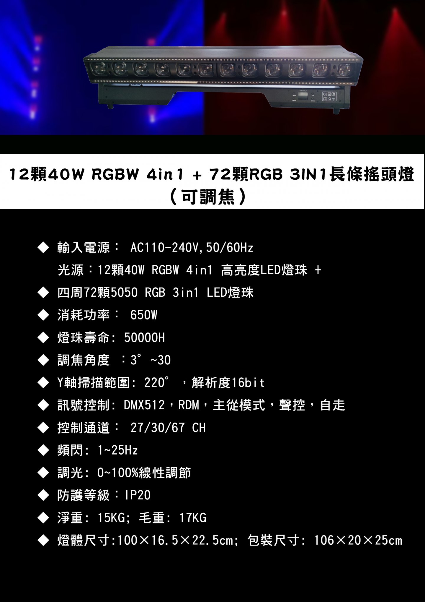 12顆40W RGBW 4in1 + 72顆RGB 3IN1長條搖頭燈(可調焦)