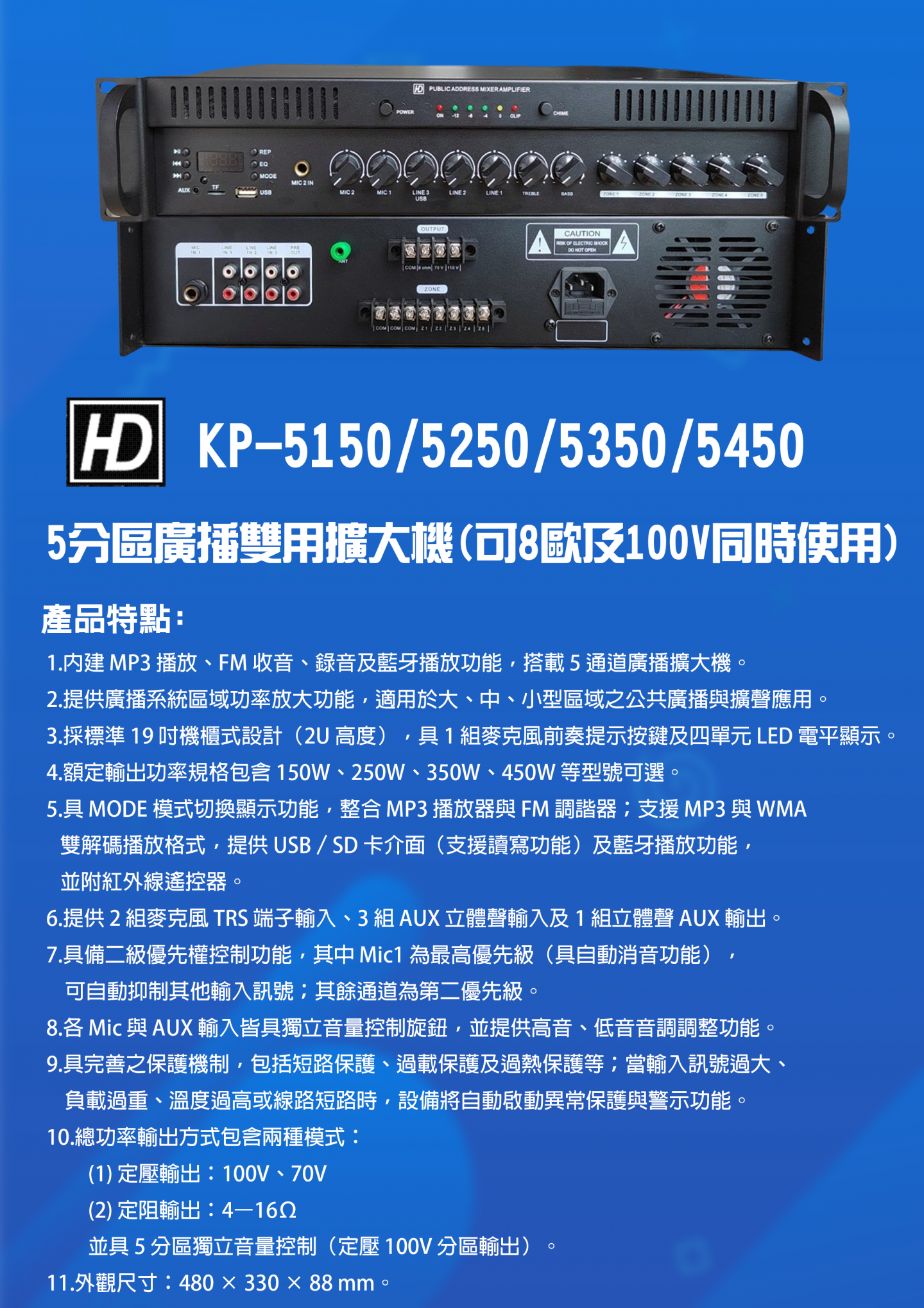 HD KP系列 5分區廣播雙用擴大機