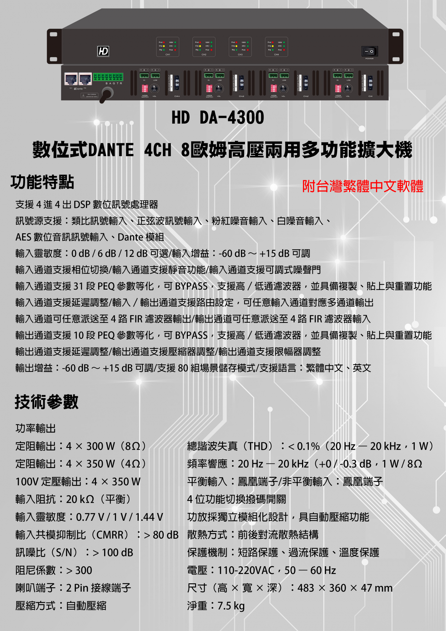 HD DA-4300 數位式DANTE 4CH 8歐姆高壓兩用多功能擴大機